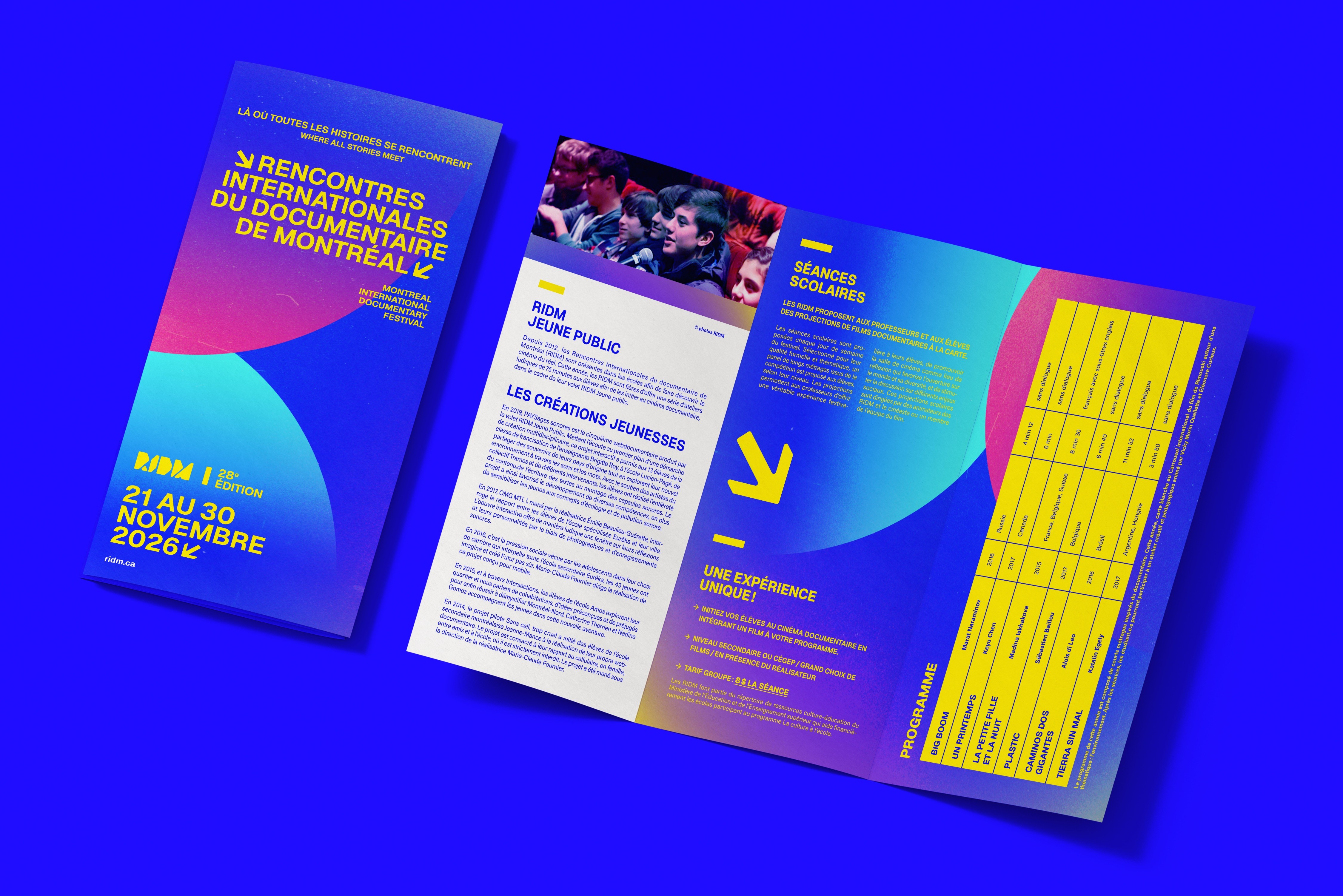 Le style visuel de lʼaffiche se décline sur plusieurs supports, notamment un dépliant RIDM Jeunesse contribuant à la médiatisation de lʼévénement, des publications Instagram et un tote bag.